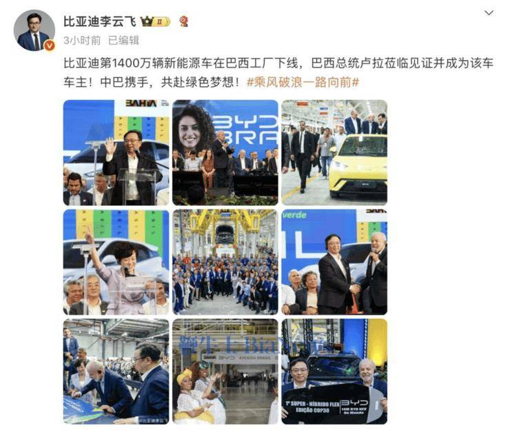 10月10日,比亚迪总经理李云飞宣布比亚迪第1400万辆新能源车在巴西工厂下线,巴西总统卢拉莅临见证并成为该车车主。该工厂位于巴伊亚州,从动工到首车下线万辆。