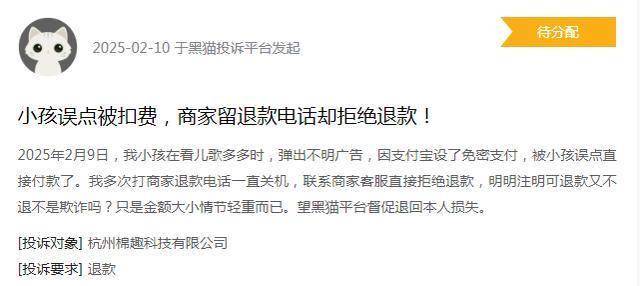 今年2月,就有一位用户在黑猫投诉平台称,孩子在使用“儿歌多多”时误点弹出广告,导致支付宝通过免密支付被扣款29.9元。