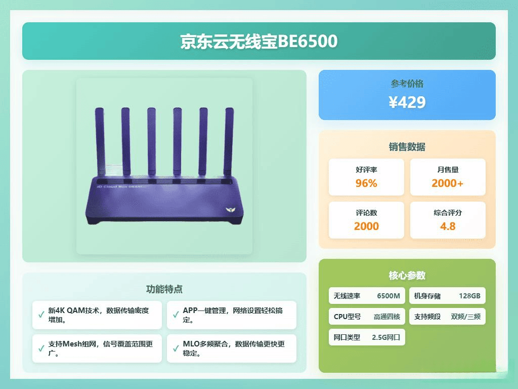 最后要介绍的是京东云无线G路由器。这款路由器支持三频Wi-Fi 6,无线M,基本满足家庭多设备同时连接的需求。它采用智能Mesh组网技术,让全屋无缝覆盖,不用担心信号死角,尤其适合大户型使用。