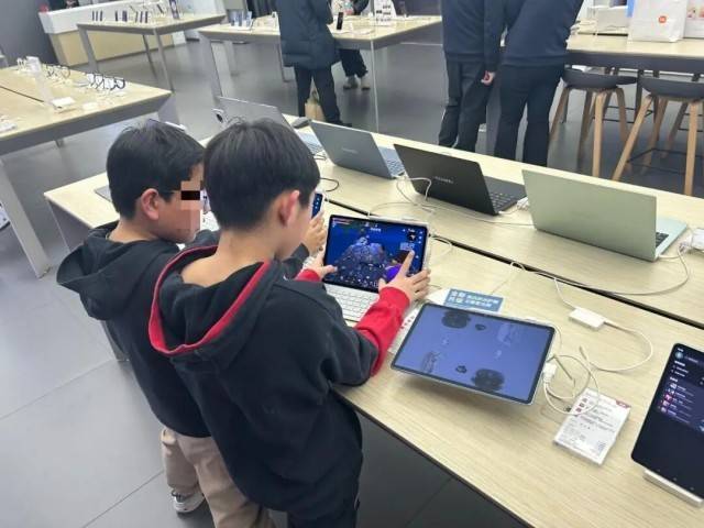 “工作日的孩子还算少的,等到周末,全都是小孩。”一位店员说道。等到记者周六下午再次来到这里,发现孩子的数量确实比前一天只多不少,尤其是在平板电脑区,几乎每一台样机都已“名花有主”,有的孩子看起来只有四五岁,也在平板上熟练地玩着游戏。