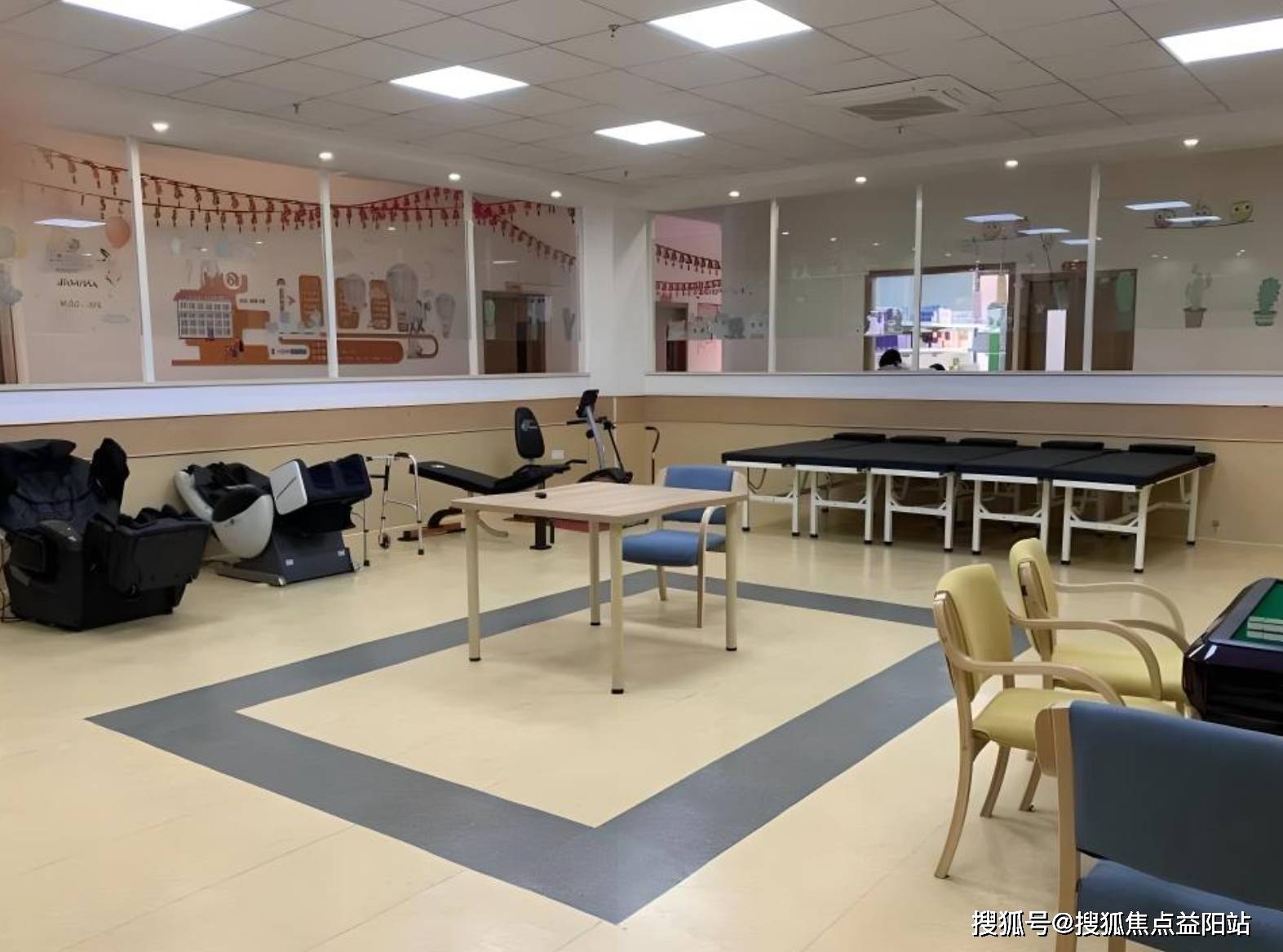 机构占地面积6660平方米,建筑面积7500平方米,整体布局参照星级宾馆标准设计。房间类型包括单人间(20-25㎡)、双人间(15㎡)及多人间(4-6人),均配备独立卫浴、空调、电视、热水器及紧急呼叫系统。公共区域设有300㎡空中花园、健康走道、凉亭、阅览室、棋牌室及影视区,活动室配备平衡训练设备、力量训练辅助工具。中央厨房通过食品安全认证,提供低糖餐、低盐餐等8类特殊饮食。