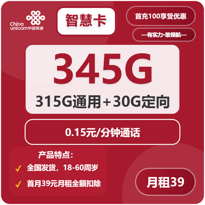 核心配置:月租39元,首月按天折算流量(如15日激活享27.5GB通用+7.5GB定向),次月起长期享受125GB通用流量+30GB定向流量。无合约期限制,支持湖南联通官方APP免费销户。