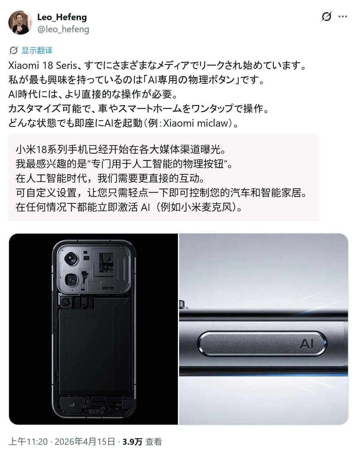 消息源 @leo_hefeng 4 月 15 日在 X 平台发布推文,分享了一组渲染图,展示了小米 18 Pro 手机,重点凸显机身侧面的 AI 按键,支持启动 AI 功能、控制智能家居及小米汽车。