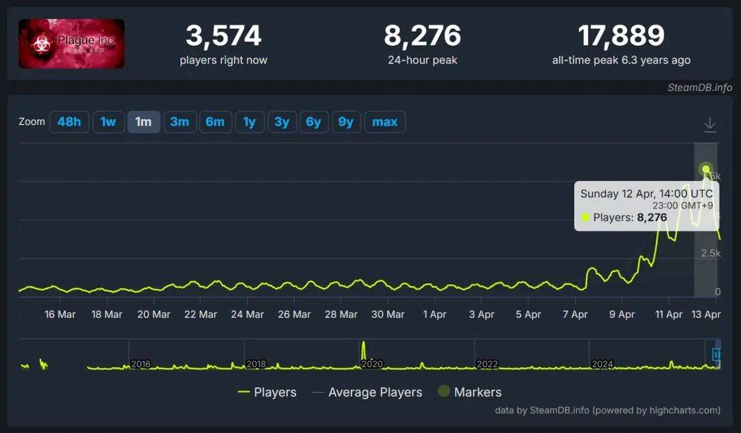 3. 上周,《瘟疫危机:进化》同时在线人数显著上升,创下今年以来新高。此次增长主要受 4 月 7 日上线的“外星人与反疫苗派”DLC 及本体史低促销带动,吸引超过 8000 名玩家回流。DLC 中,玩家可以利用来自宇宙边缘、搭乘陨石而来的外星水晶改造地球。游戏同时新增了六个剧情模式,包括“反疫苗”(围绕削弱公众对疫苗的阴谋论)与“群体免疫”(感染者可获得自然免疫力)。