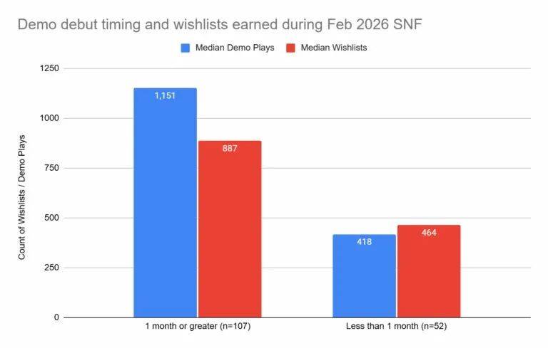 针对近期开发者流行的“临近开幕才发布 Demo”策略(即通过制造惊喜提升热度),Zukowski 认为这一做法并不妥当。根据其长期数据分析,在活动前一个月以上发布 Demo 的游戏,其展期玩家数与愿望单增长中位数,均显著高于临近发布的作品,约为后者的两倍左右。