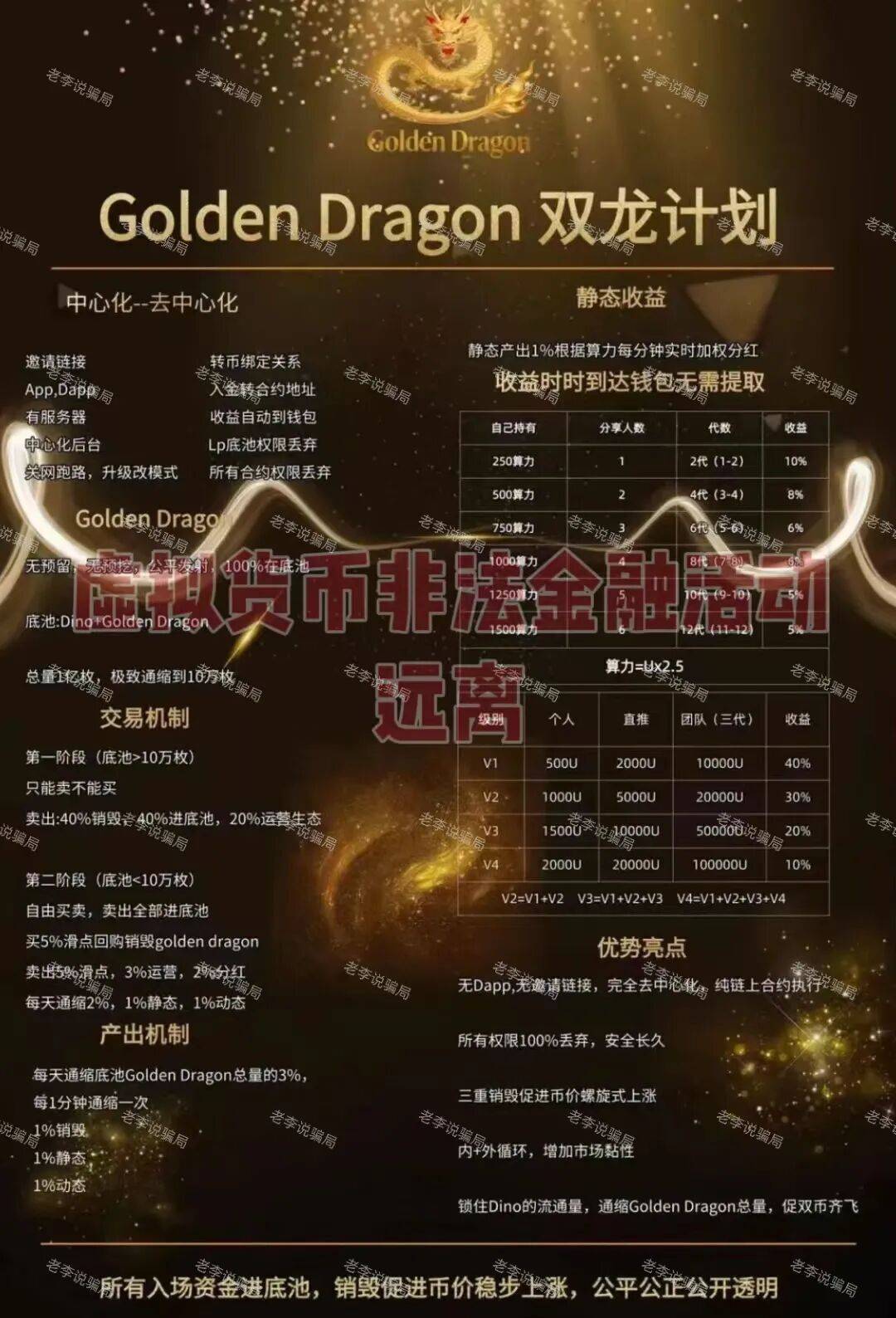 打着“去中心化区块链”的旗号,用“通缩销毁、底池锁仓”等话术进行包装。一边宣称“完全去中心化、无邀请链接”,一边却设置了多层级拉人头奖励机制。