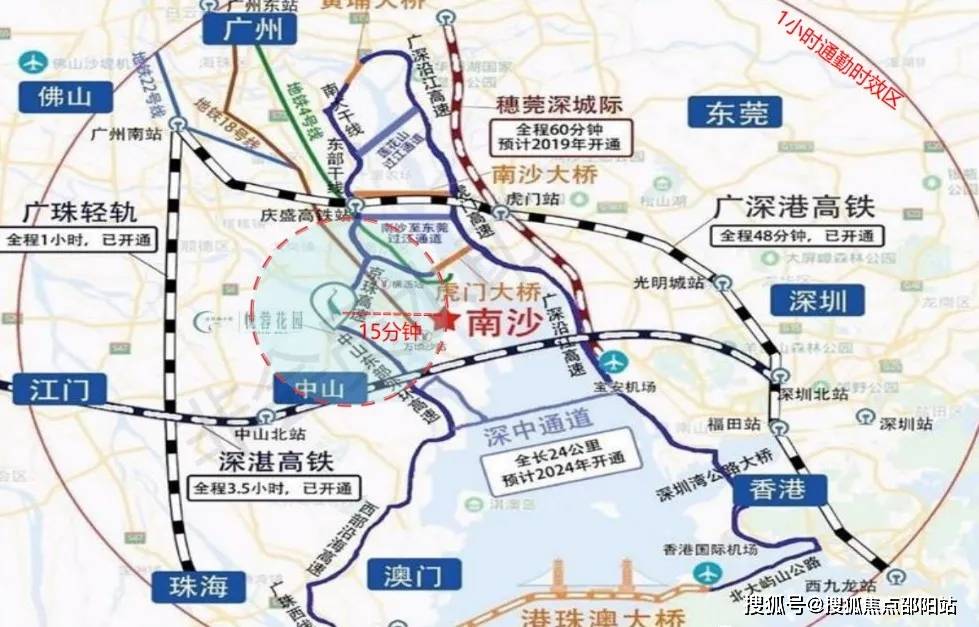 南沙港快速、中江高速、广珠西线互相贯通,至珠三角主要城市时间均在 1 小时以内,去深圳机场、白云机场、珠海机场 1 小时左右。4: