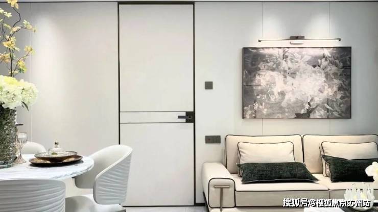 全屋一体化设计,率先使用全金属天地一体化包边设计。客厅无主灯设计搭配悬浮吊顶,同时将空调出风口一体化隐藏,而空调回风口则是与入户门吊顶完美融为一体。通过简洁的轻奢化精装,打造纯粹、整体感强的生活质感。