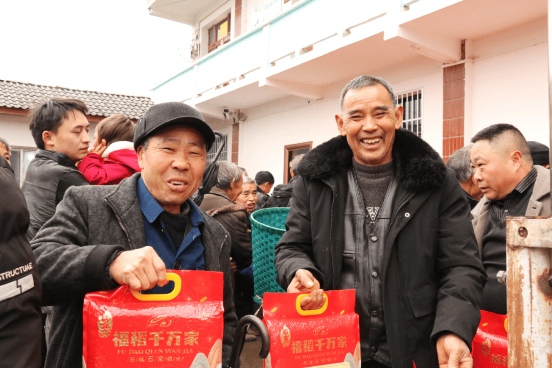 现场秩序井然,工作人员一边引导村民有序排队,一边仔细核对信息、发放大米,沉甸甸的大米递到村民手中,分量十足,暖意也跟着传到了心里。