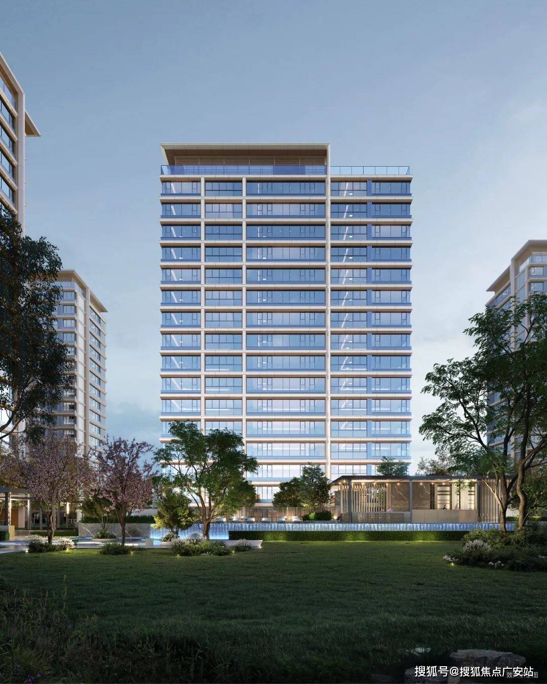 现代简约风,外立面采用大面积玻璃加铝板,打造非对称L型立面,材质造价更高,抗腐蚀性程度更高。