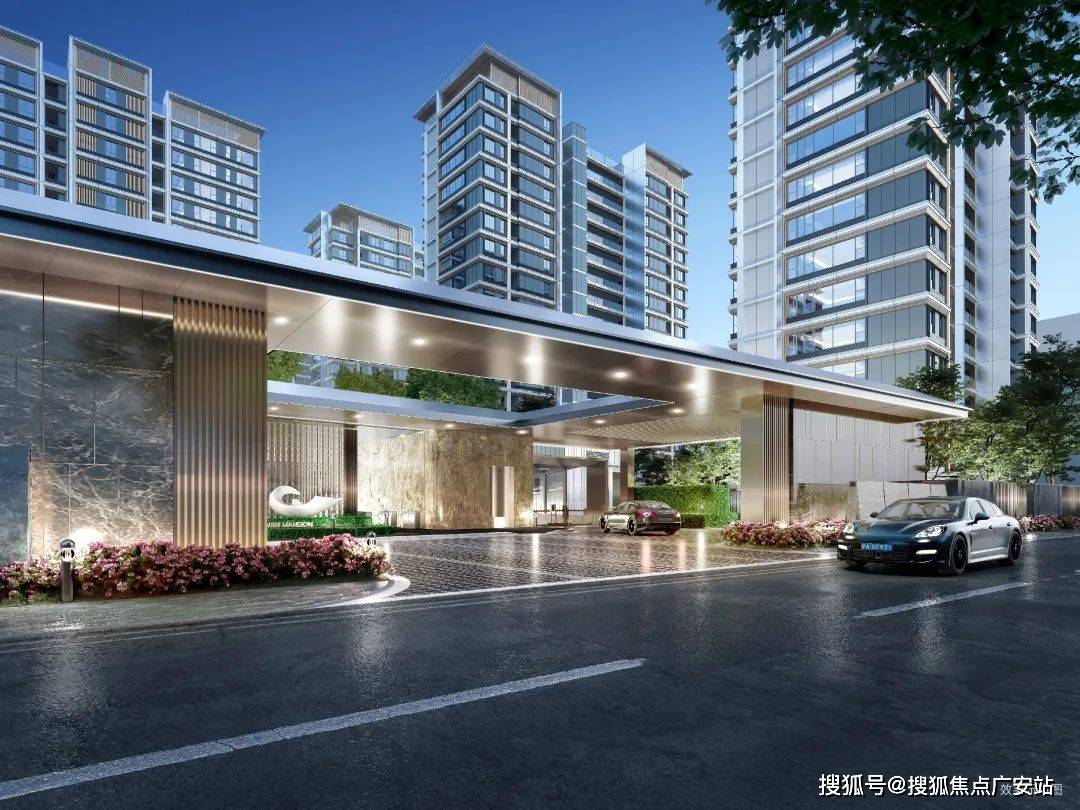 尺度大气的现代风格门头,入口展现艺术水苑、叠水瀑布以及层级绿化,彰显归家仪式感。