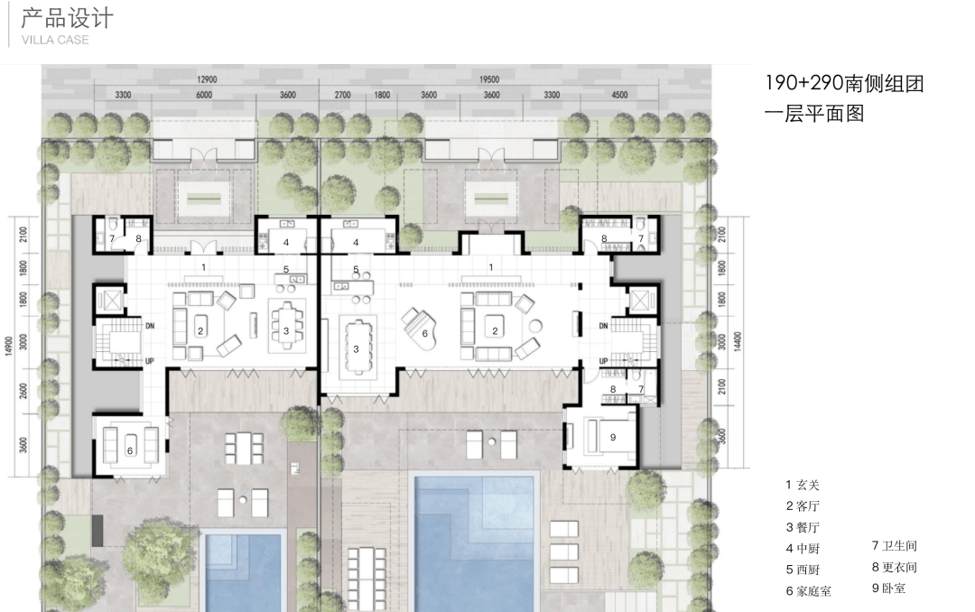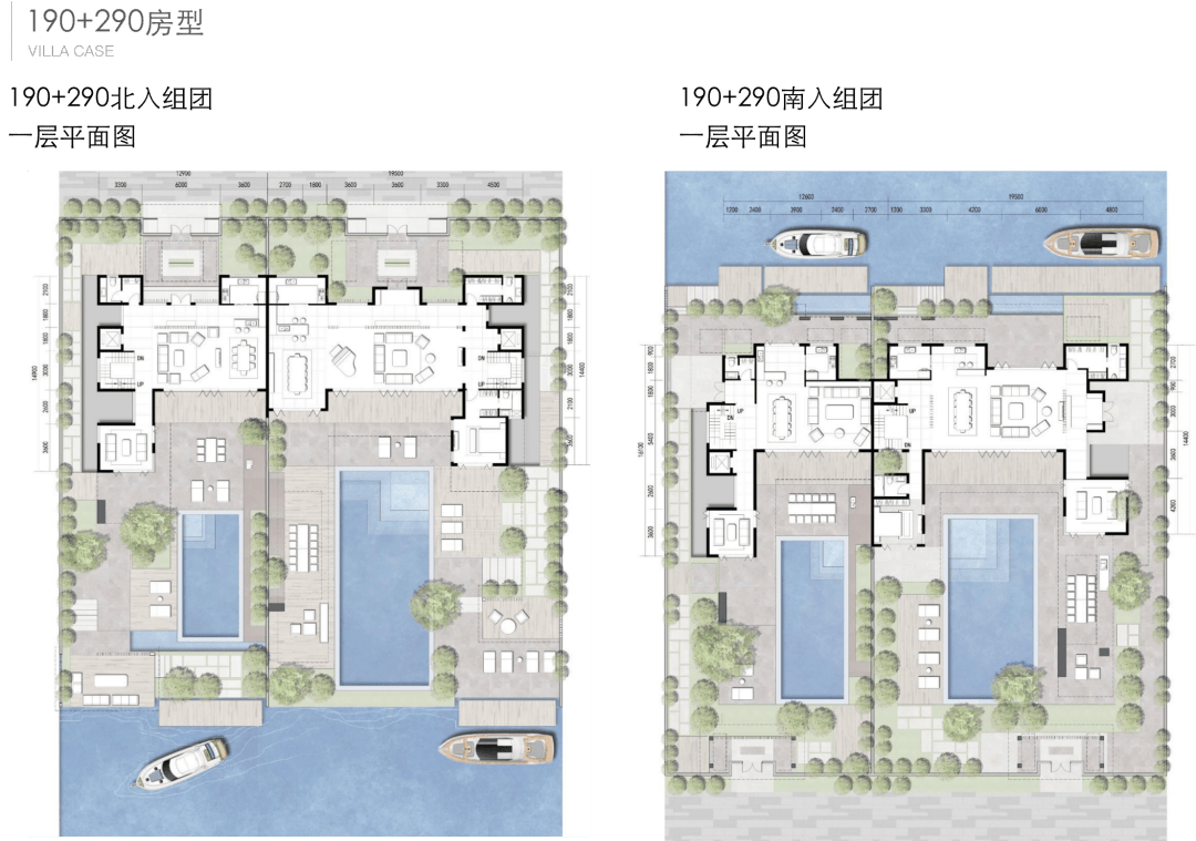 北入户的190+290房型,一层朝南直面庭院和泳池,如果配上整扇的落地玻璃移门......