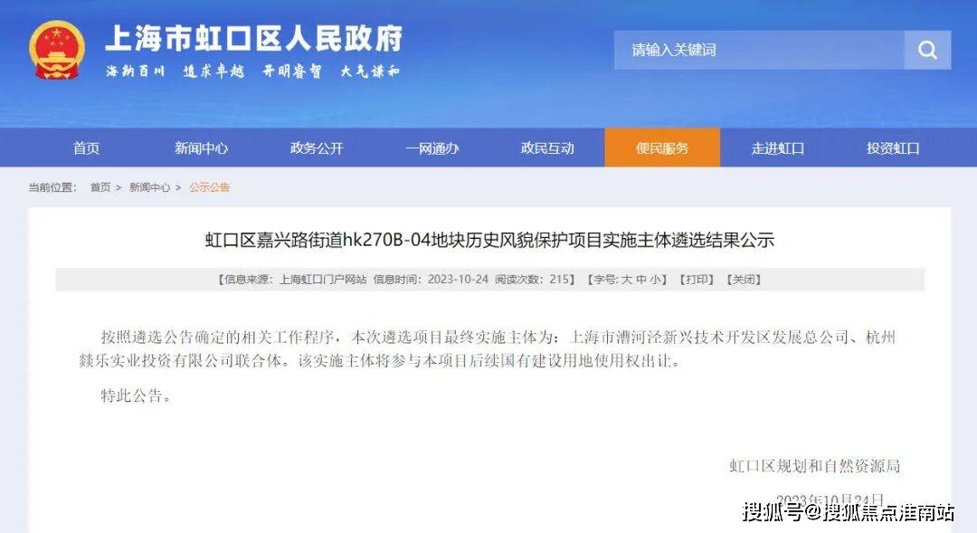 虹口区嘉兴路街道hk270B-04地块历史风貌保护项目实施主体遴选结果公示,终确定由上海市漕河泾新兴技术开发区发展总公司(临港集团)及杭州燚乐实业投资有限公司(越秀)联合开发。