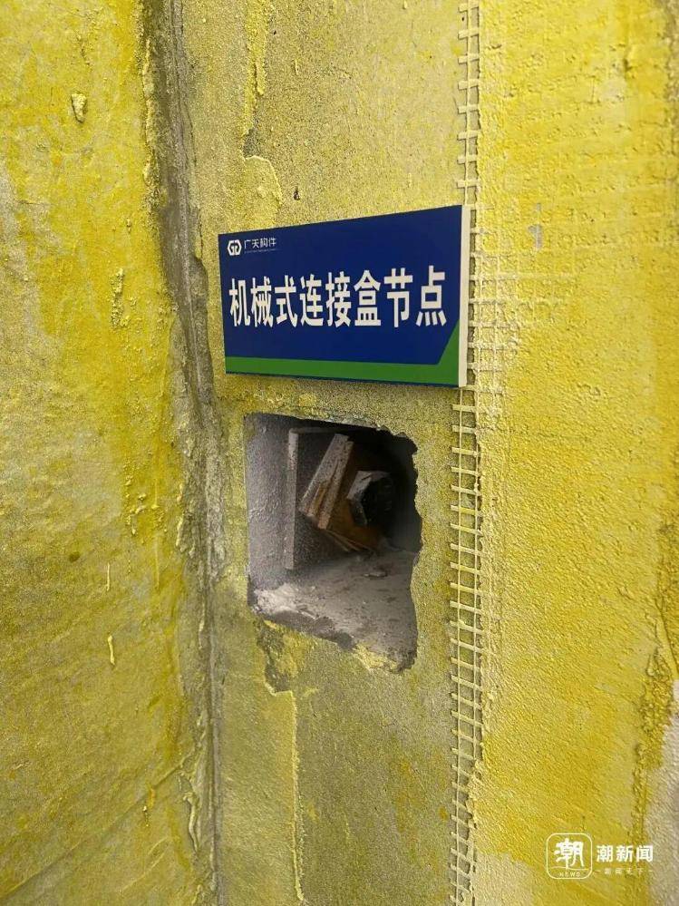 从外观看,它和浙江许多乡村精品民宿并无二致。不同之处,藏在墙里。二楼卧室,专门保留了一面未粉刷的钢筋混凝土墙。墙上几个圆形、方形孔洞,分别标注了“墙板支撑固定节点”和“机械式连接盒节点”。